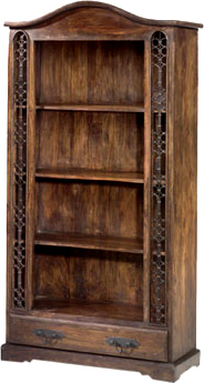 This is an Iron Jali bookcase which is ideal for living room. Capsule shaped Iron Jali on front panels, 3 removable shelves with Iron handles on 1 drawer at the bottom. 100% Sheesham wood (Indian Rosewood) imported directly from Northern India.